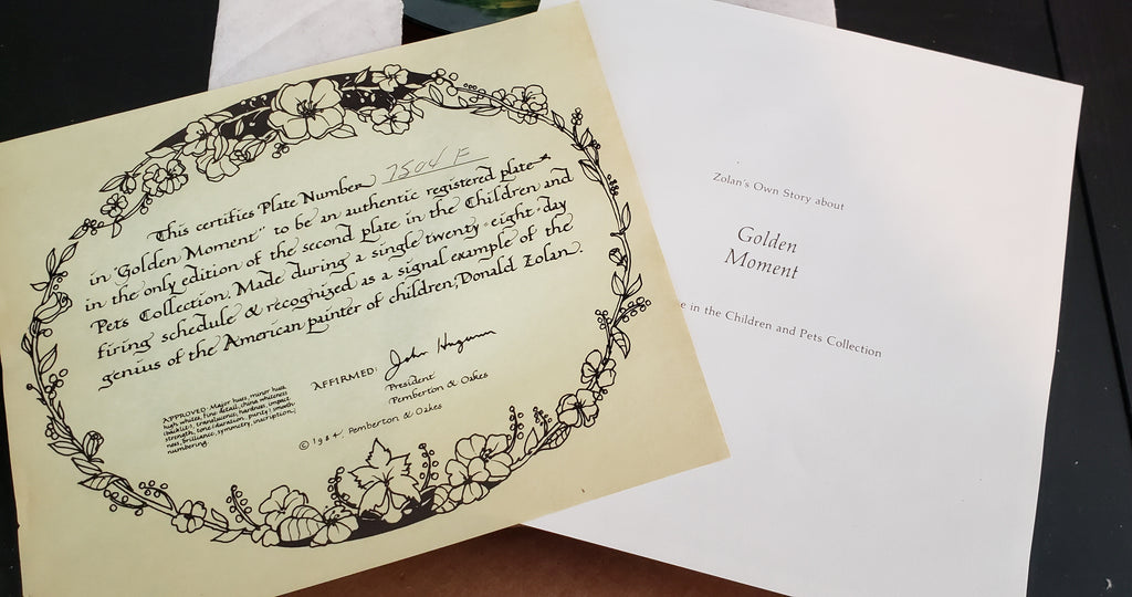 "Golden Moment" is the second plate in the Children and Pets Collection by America's beloved painter of children, Donald Zolan. Made during a 28 day firing schedule for the year 1984.