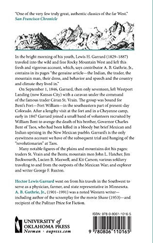 In the bright morning of his youth Lewis H. Garrard traveled into the wild and free Rocky Mountain West and left us this fresh and vigorous account, which, says A. B. Guthrie, Jr., contains in its pages "the genuine article-the Indian, the trader, the mountain man, their dress, and behavior and speech and the country and climate they lived in." On September 1, 1846, Garrard, then only seventeen years old, left Westport Landing (now Kansas City) with a caravan under the command of the famous trader Céran St. Vrain, bound for Bent's Fort (Fort William) in the southeastern part of present-day Colorado. After a lengthy visit at the fort and in a camp of the Cheyenne Indians, early in 1847 he joined the little band of volunteers recruited by William Bent to avenge the death of his brother, Governor Charles Bent of Taos, killed in a bloody but brief Mexican and Indian uprising in that New Mexican pueblo. In fact, Garrard's is the only eyewitness account we have of the trial and hanging of the "revolutionaries" at Taos. Many notable figures of the plains and mountains dot his pages: traders St. Vrain and the Bents; mountain men John L. Hatcher, Jim Beckwourth, Lucien B. Maxwell, Kit Carson, and others; various soldiery traveling to and from the outposts of the Mexican War; and explorer and writer George F. Ruxton.