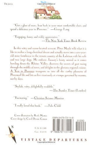 In this witty and warm-hearted account, Peter Mayle tells what it is like to realize a long-cherished dream and actually move into a 200-year-old stone farmhouse in the remote country of the Lubéron with his wife and two large dogs. He endures January's frosty mistral as it comes howling down the Rhône Valley, discovers the secrets of goat racing through the middle of town, and delights in the glorious regional cuisine. A Year in Provence transports us into all the earthy pleasures of Provençal life and lets us live vicariously at a tempo governed by seasons, not by days.