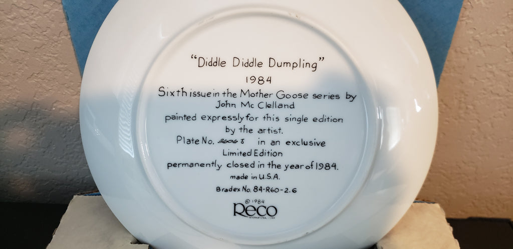 Sixth issue in the Mother Goose series by John McClelland painted expressly for this single edition by the artist. This plate is an exclusive Limited Edition permanently closed in the year of 1984. Made in the USA.